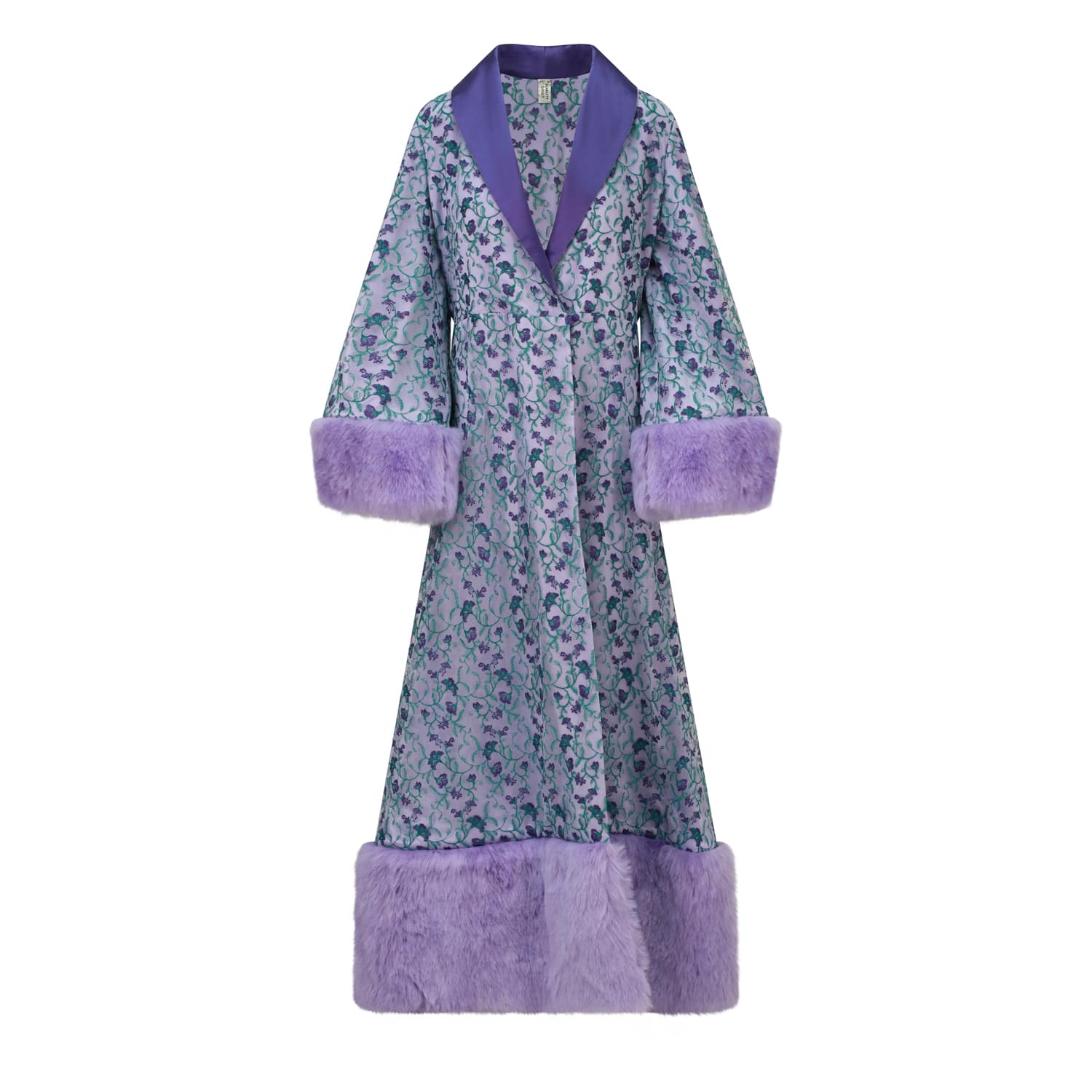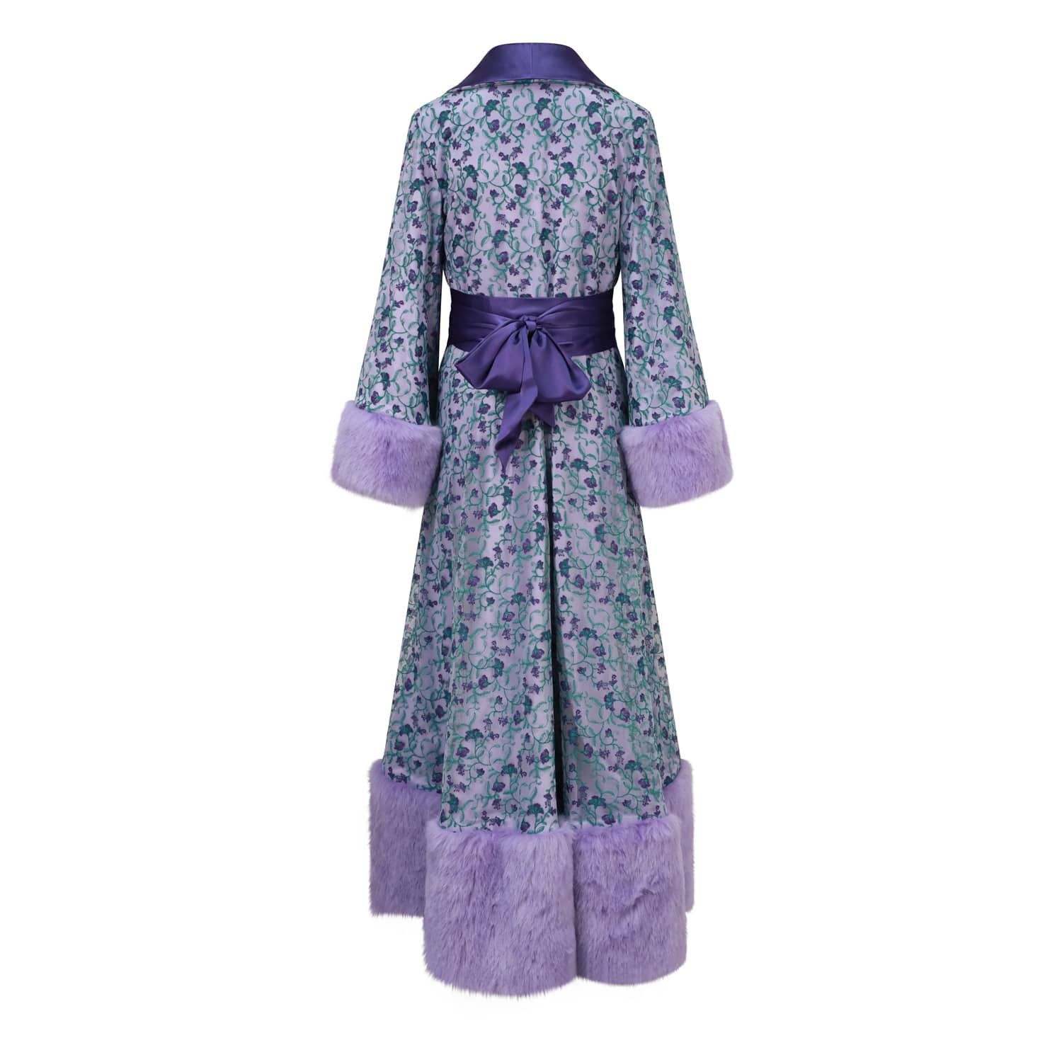 Be dipped head to toe in botanical embroidery perfection with rich royal purple faux fur trimmings and a deep purple silk sash. Completed with hand-covered silk buttons, our Wisteria Robe is perfect for evenings in the garden or cocktails in the boudoir.