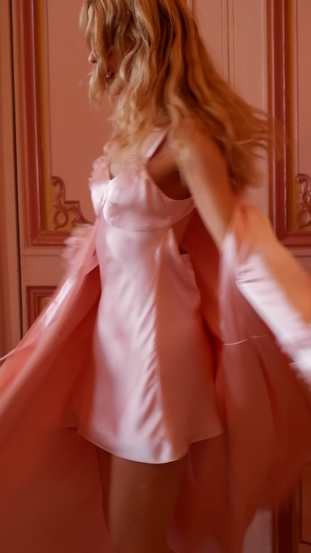 Immerse yourself in premium silk charmeuse, chosen for its smooth, liquid drape and soft, natural sheen. Falling to the floor with elegant movement, creating a refined and graceful silhouette.