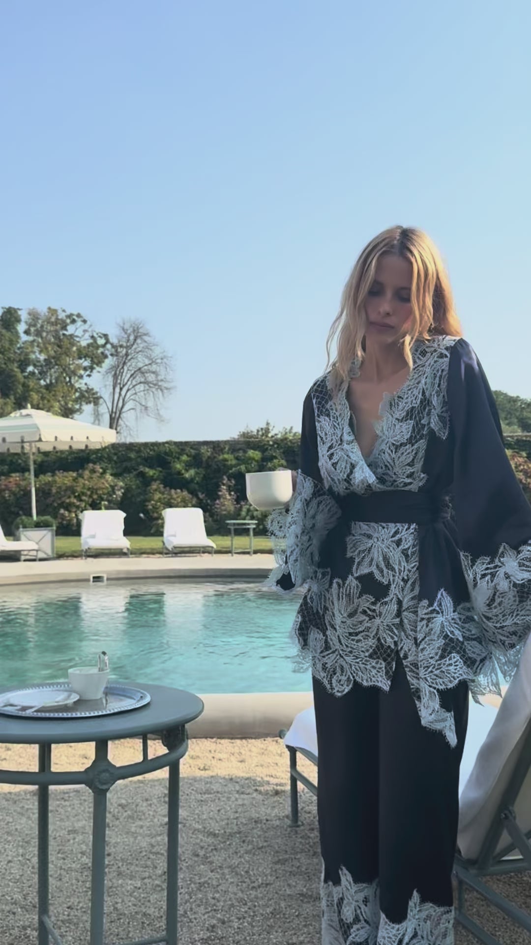 Handcrafted in our London atelier, the Jayne Robe wraps the body in pure silk charmeuse, falling with a smooth, liquid drape that feels effortless against the skin. The deep navy hue invites a sense of calm indulgence, while delicate lace trims trace the collar, cuffs, and hem with soft, shadow-like allure.