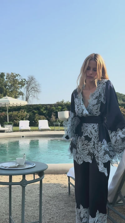 Finished with immaculate French seams and secured with an Italian-made pearl crystal button, it is an ode to quiet sensuality and refined craftsmanship. A timeless layer of elegance, perfect for slow evenings and intimate, lingering moments at home.